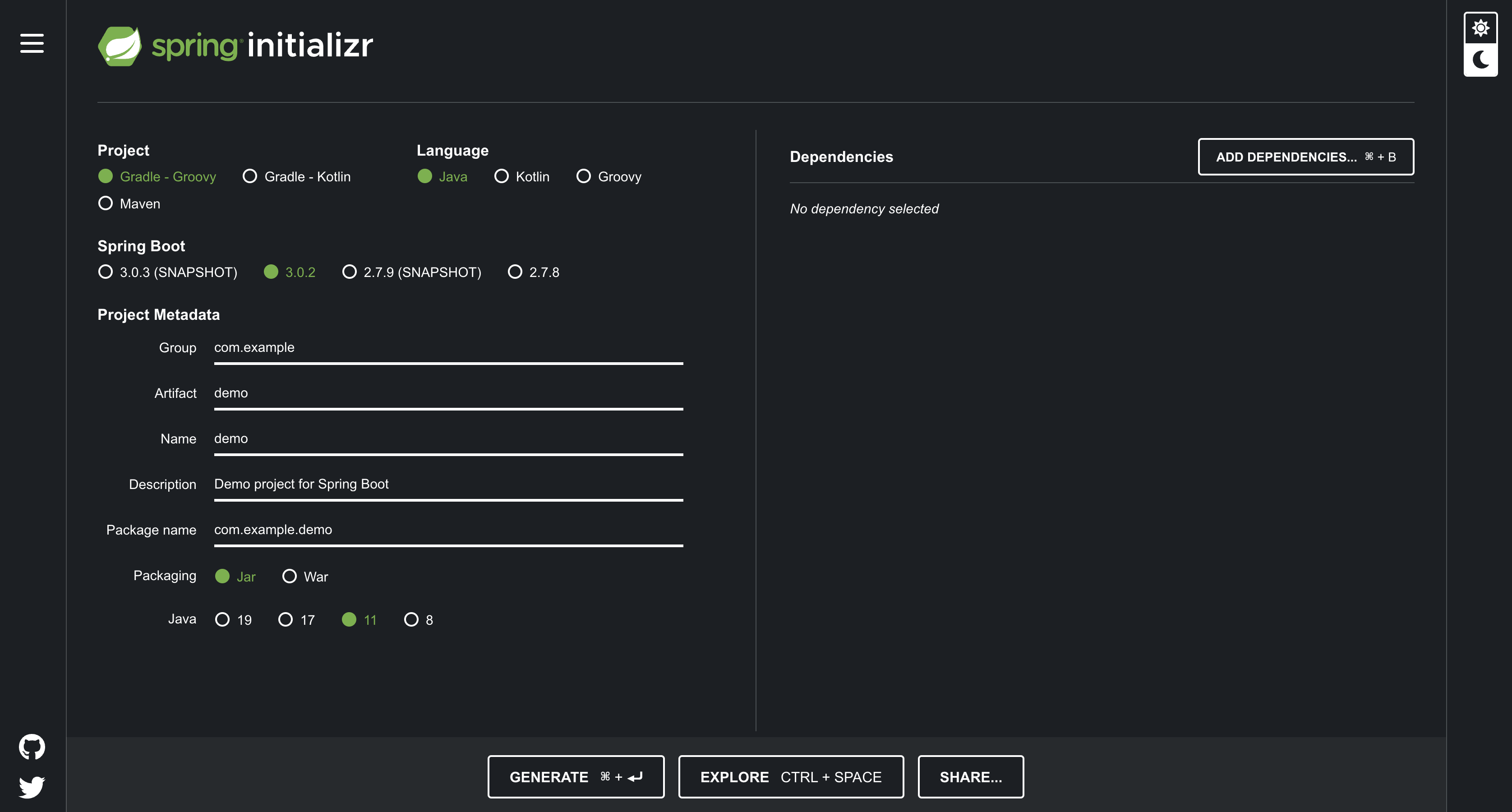 - https://start.spring.io/ 에서 설정 후 spring boot 프로젝트 생성한다.