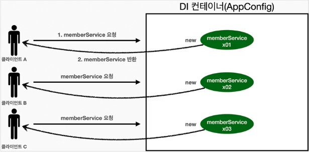 순수 DI 컨테이너는 AppConfig 요청마다 객체를 새로 생성한다. -> 해당 객체를 1개만 생성 후 공유하도록 설계한다. (싱글톤 패턴)